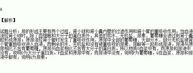 下表是一个正常人的血浆、原尿和尿液的检验结果(“√”表示含有,“×”表示不含有),请判断O、P、Q分别代表的物质是( )