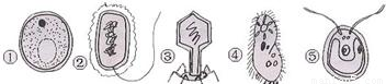 | A、①是酵母菌,②是细菌,③是病毒,④是草履虫,⑤是衣藻 | B、有细胞壁的是①②⑤;有成形细胞核的是①②④⑤;无细胞膜的是③ | C、有荚膜的是②;有叶绿体的是⑤;有伸缩泡的是④;有纤毛的是④ | D、⑤营自养生活;①②③④营异养生活.③营寄生生活,①营腐生生活 |