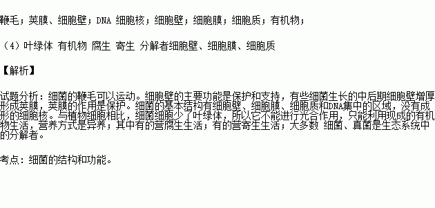 细菌的运动结构是 ,对细菌起保护作用的是 ,细菌的遗传物质是 ,没有成形的 ,细菌与植物细胞基本相同的结构是 、 和 。与植物细胞不同,多数细菌没有叶绿体,因此只能利用现成的 生活,并把有机物分解成简单的 ,成为生态系统中不可缺少的分解者。