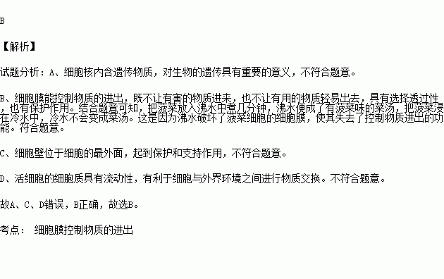 把菠菜放入沸水中煮几分钟,沸水便成了有菠菜味的菜汤,假如把菠菜浸在冷水中,冷水不会变成菜汤,出现这种现象的原因主要是沸水破坏了细胞的( )