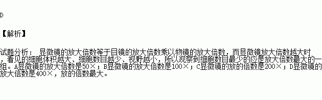 小红同学在用显微镜观察洋葱鳞片表皮细胞,显微镜的目镜有5×和10×两种,物镜10×和40×两种,下列组合中观察到细胞数目最少的是( )