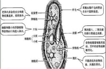 草履虫是一种常见的单细胞生物,右图是它的形态结构示意图, 请填写各部分名称