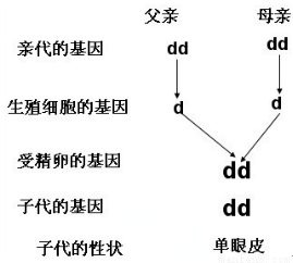双眼皮是显性性状,单眼皮为隐性性状,因此夫妇双方都是单眼皮,其控制眼皮的基因组成都是隐性如dd,其子女的控制眼皮的基因来自于父母双方,因此其子女的控制眼皮的基因组成也都是隐性dd,性状表现都是单眼皮;因此这对夫妇不可能生出双眼皮的孩子.假设双眼皮有显性基因D控制,单眼皮有隐性基因d控制,一对均为单眼皮的夫妇的遗传图解如图所示: