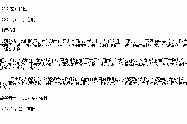 (1) 图是家兔的牙齿,牙齿的不同表明两种动物 的不同.