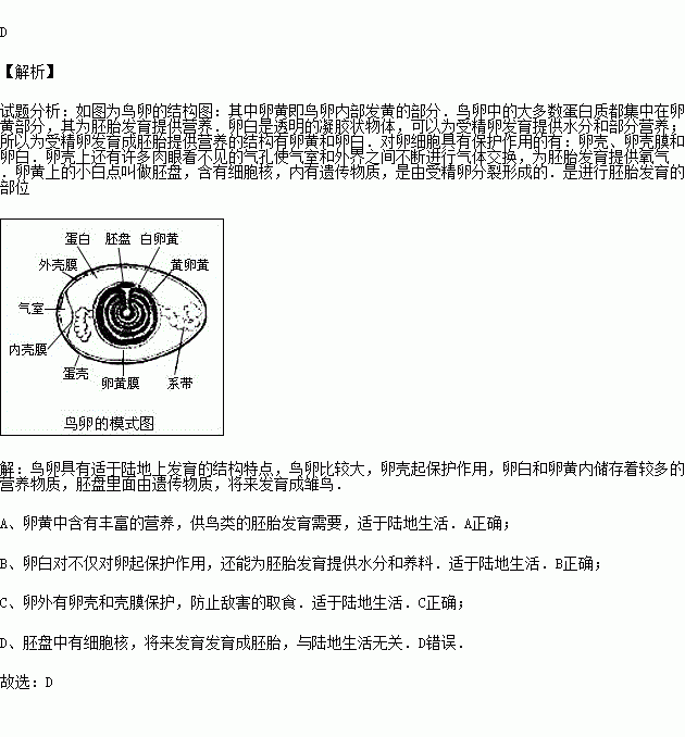 C.有卵壳和卵壳膜的保护 D.胚盘中有细胞核