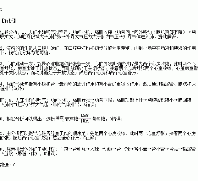 C.心脏各腔室工作的顺序是:心房收缩,心室舒张→心室收缩,心房舒张→心房、心室均舒张