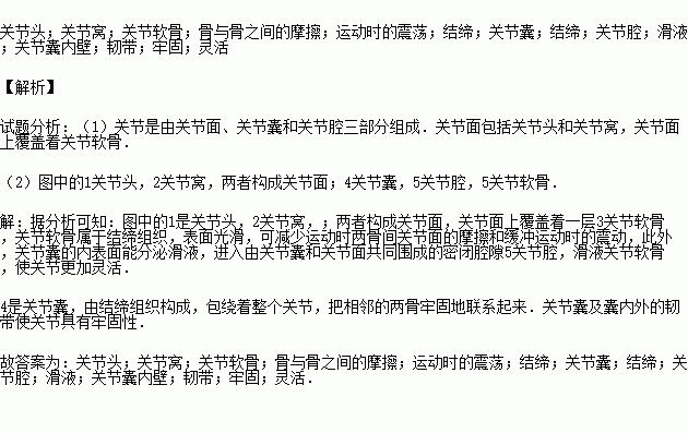 图中1是 ,2是 ;二者相对的面上有一层3,这是 ,具有减少 ,缓冲 的作用,属于 组织;4是 ,由 组织构成;5是 ,内有少量 ,是由 分泌的.另外,关节囊外还有 .由图可以看出,关节结构具有既 又 的特点.