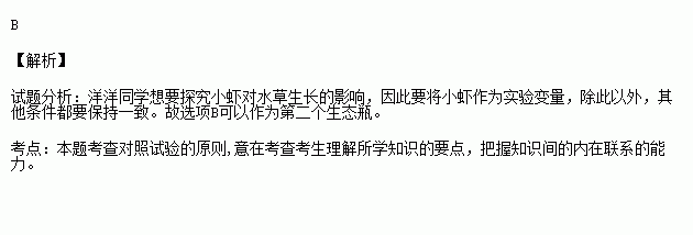 洋洋同学想要探究小虾对水草生长的影响,她做了两个生态瓶,其中一个所处的环境和条件如右图所示。那么,下列各项中,可作为她探究实验第二个生态瓶的应该是( )