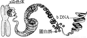 分析:此题考查的知识点是染色体、DNA、基因的关系及细胞分裂的过程.解答时可以从染色体的概念、组成、DNA的分子结构特点、基因的概念方面来切入.a是染色体,b是DNA.