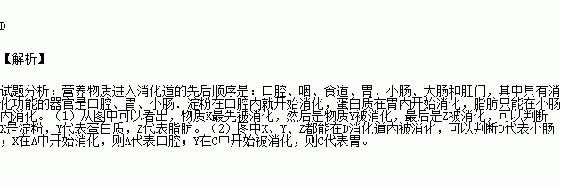 下图中A、B、C、D依次表示消化道相邻的器官,曲线X、Y、Z表示三大类有机物在上述器官中被消化的程度。下列叙述正确的是