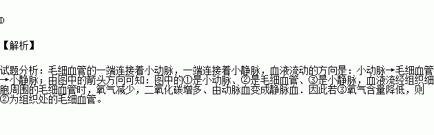 D.如果③氧气含量降低,则②为组织处的毛细血管