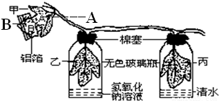 【答案】分析:本题中的实验装置设置了两组对照实验:叶片甲的遮光部分和见光部分,变量是光;叶片乙和叶片丙,变量是二氧化碳;目的分别是探究光合作用的条件是光、原料是二氧化碳.