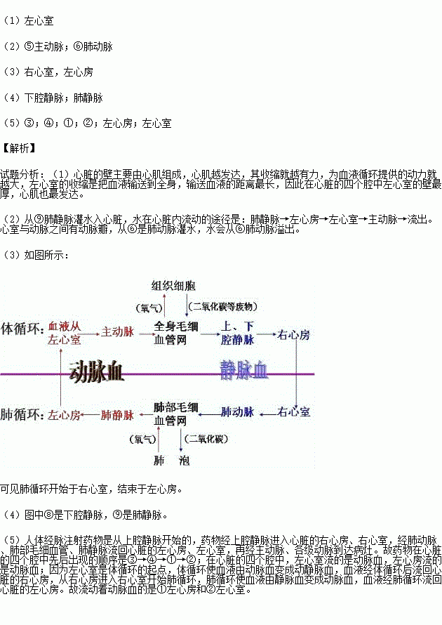 (5)人生病后注射药物,药物进入心脏四个腔的顺序依次是 → → → (填数字序号);在心脏的四个腔内流动着动脉血的是 和 .