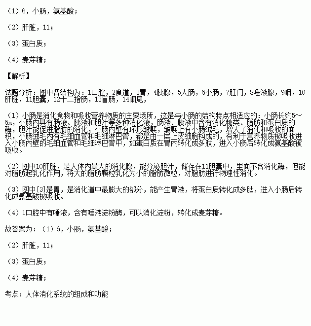 (1)人体内消化和吸收的主要器官是[ ] ,营养物质如蛋白质在这里最终被分解成 。