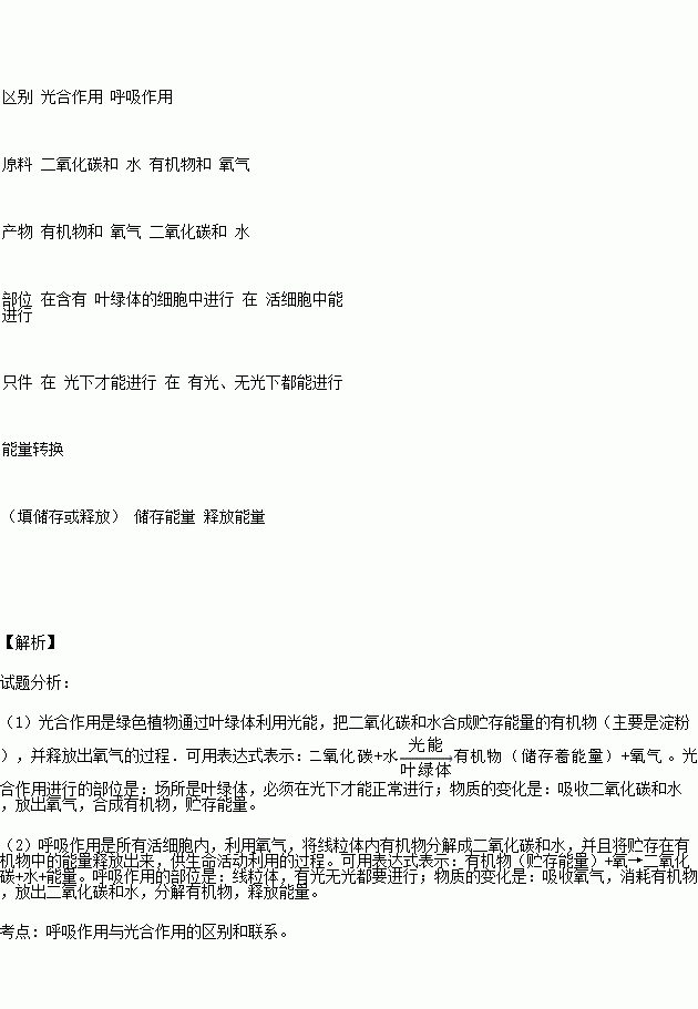 列表比较光合作用和呼吸作用的区别