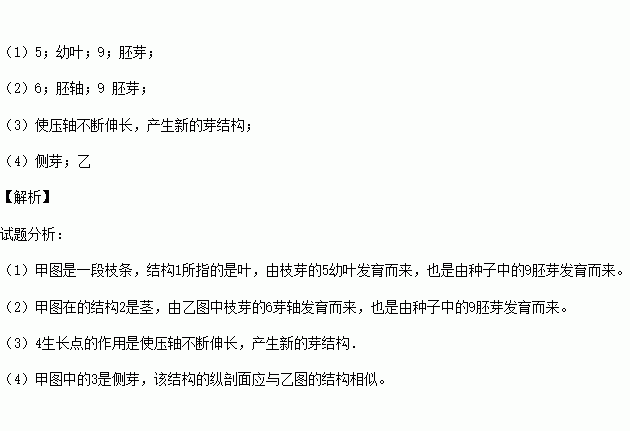 下图是某一植物的一段枝条、枝芽(纵切)和种子的结构(纵剖)示意图。请据图回答: