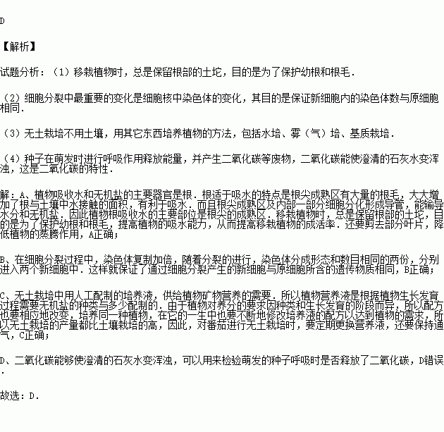 A.移栽花木时根部要带土,还要剪去部分叶片