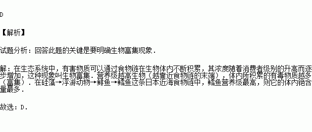 2011年3月,日本东北部海域发生地震并引发海啸,地震造成日本福岛第一核电站发生核泄漏事故,最近从日本近海海水中检测出放射性铯.在硅藻→浮游动物→鲱鱼→鳕鱼这条日本近海食物链中,铯含量最高的生物是( )