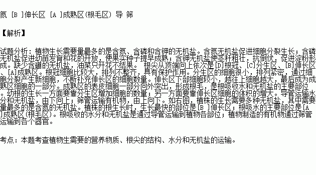 (5分)如图,植株的生长需要多种无机盐,其中需要量最多的是含______的无机盐。植株的根生长时,生长最快的部位是〔 〕____________;根吸水的主要部位是〔 〕___________。根吸收的水分和无机盐是通过______管运输到植物各部位;植物制造的有机物通过_____管运输到各个器官。