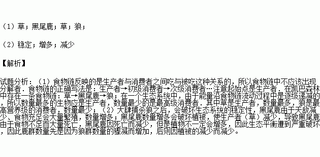 (2)大肆捕杀狼之前,鹿生活在一个相对 的森林生态系统中,大肆捕杀狼之后,鹿群数量先是因狼群数量的骤减而 ,后则因植被的 而减少。