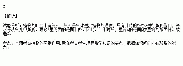 取同一植物相同大小的两个枝条,分别标上A、B。枝条A保留叶片,枝条B摘除叶片,然后将他们分别插入两个相同大小盛有等量清水的量筒中。在量筒中滴加油滴,让油滴铺满水面。将这两个装置放在相同的环境条件下24小时后,量筒中液面的变化及原因是( )