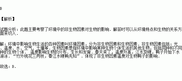 宋代诗人苏轼在《惠崇春江晚景》中写道:“竹外桃花三两枝,春江水暖鸭先知.”这句诗描述的是哪一种非生物因素影响了鸭的生活( )