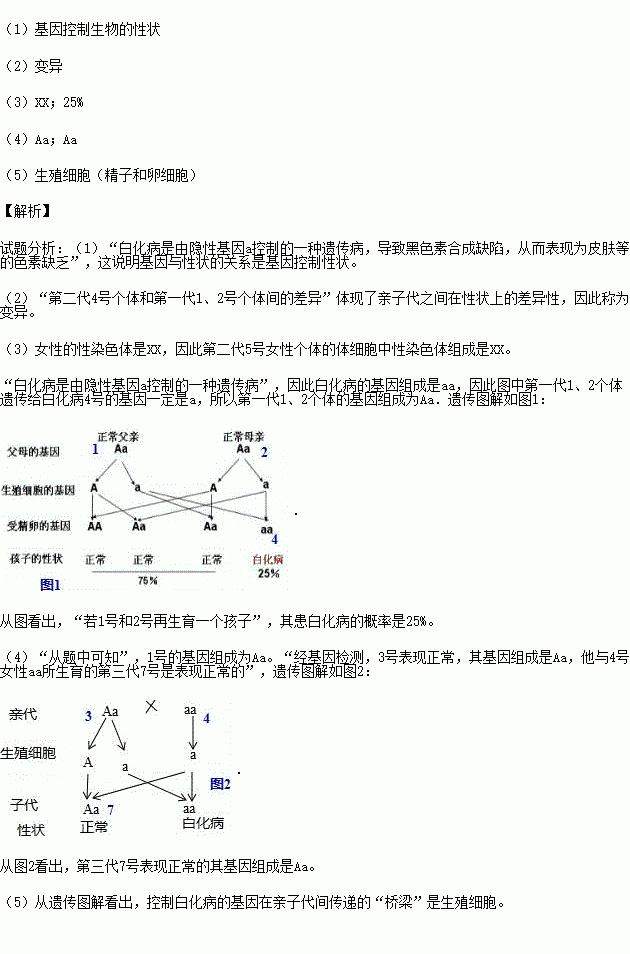 (5)控制白化病的基因在亲子代间传递的“桥梁”是 .