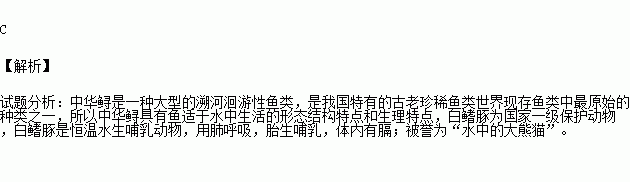 我国特有的中华鲟和白鳍豚终身生活在水中。中华鲟用鳃呼吸,卵生;白鳍豚用肺呼吸,胎生。它们分别属于: