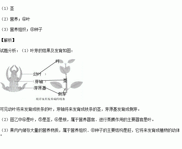 (3)图丙中⑦是可以食用的果肉,其主要组织是 ,胚是新植物体的幼体,它位于图中[ ] .