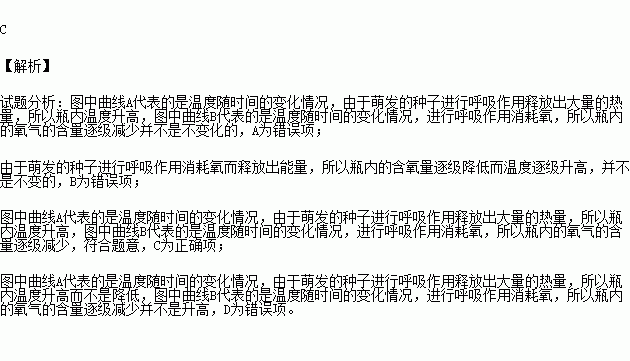 一个密闭的保温装置中装有正在萌发的种子,每隔一段时间测定其内的温度和氧气含量,并将结果绘制成曲线。如果横轴表示时间,纵轴表示温度和氧气含量。下列曲线图中能够正确反映温度(A)和氧气含量(B)随时间变化的是( )