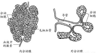 【答案】分析:人体内的腺体根据分泌物的去向可以分为内分泌腺和外分泌腺:皮脂腺、汗腺、唾液腺等,它们的分泌物是通过导管排出的,因此这类腺体叫外分泌腺;没有导管,分泌物直接进入腺体内的毛细血管里,随着血液循环输送到全身各处,这类腺体叫内分泌腺.如图: