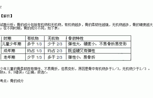 少年儿童的骨柔韧而有弹性、不易骨折,但易变形,原因是骨中( )