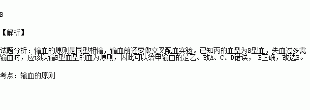 甲、乙、丙三人同行,丙受伤急需输大量血,已知丙的血型为B型,甲的血型为AB型,乙为B型,可以给丙输血的是( )