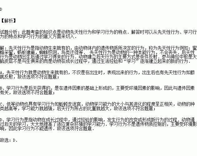 D.学习行为的获得使动物能够更好的适应周围环境,但这种行为不能遗传给后代