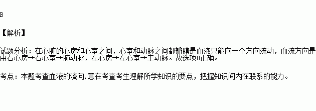 A、右心房→右心室→肺动脉 B、左心室→左心房→主动脉