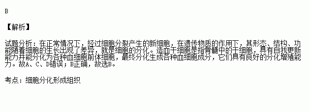 骨髓移植能够治疗再生障碍性贫血,是因为健康人骨髓中的造血干细胞能不断产生新的血细胞(如图),这一过程称为细胞的( )