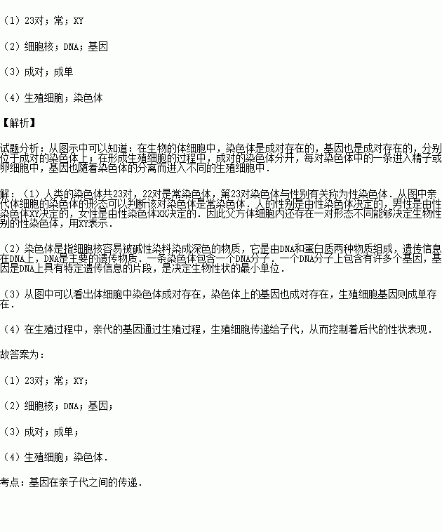 (3)从图中可以看出体细胞中染色体成对存在,染色体上的基因也 存在,生殖细胞中基因则 存在.