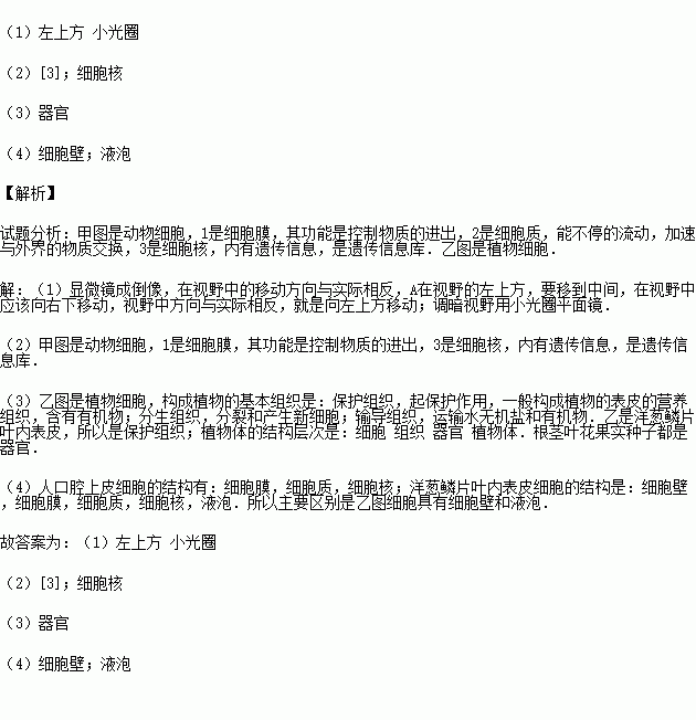 (1)观察时,如果想把甲图视野中左上方的A细胞移到视野中央,可向 移动装片.为更好地观察口腔上皮细胞,需要将视野调暗,小明须改用 和平面反光镜.