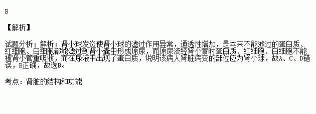 某患者肾脏受损,长期检测发现尿液中蛋白质超标。最可能导致该结果的原因是