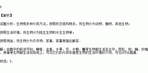 某小组将调查到的生物进行了分类,他们将鲫鱼、金鱼、水草、花、水鸭、蟹归为一类,而将松、柏、蝇、玫瑰、麻雀归为一类,他们是按照什么方法归类的?( )