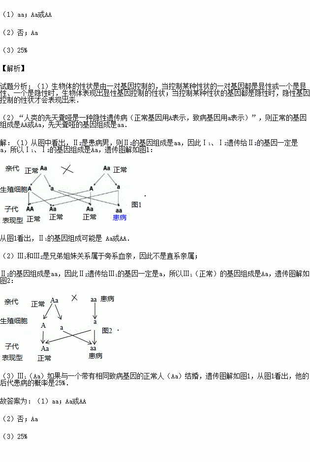 人类的先天聋哑是一种隐性遗传病(正常基因用A表示,致病基因用a表示),其致病基因在常染色体上.如图是该家庭的遗传病的系谱图,I、Ⅱ、Ⅲ分别为该家庭成员的第一、二、三代.请根据图示及所学知识回答问题