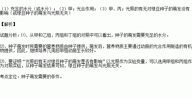 (3)要证明“光照的有无对绿豆种子的萌发是否有影响”,在实验设计上可选用 两组作对照。根据这组对照实验的现象你得出的结论是: 。