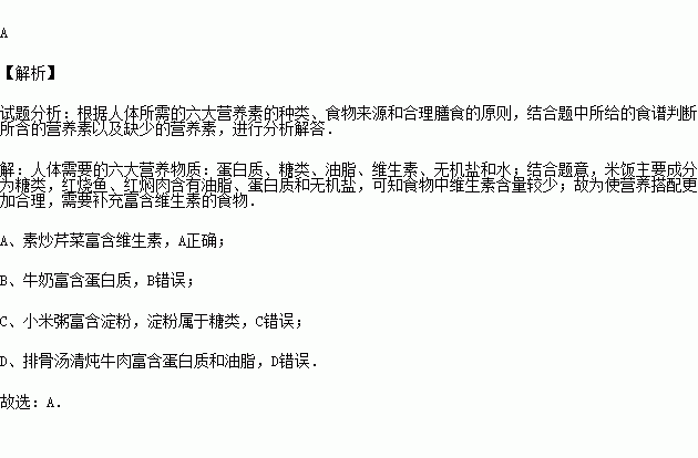 A.素炒芹菜 B.牛奶 C.小米粥 D.排骨汤