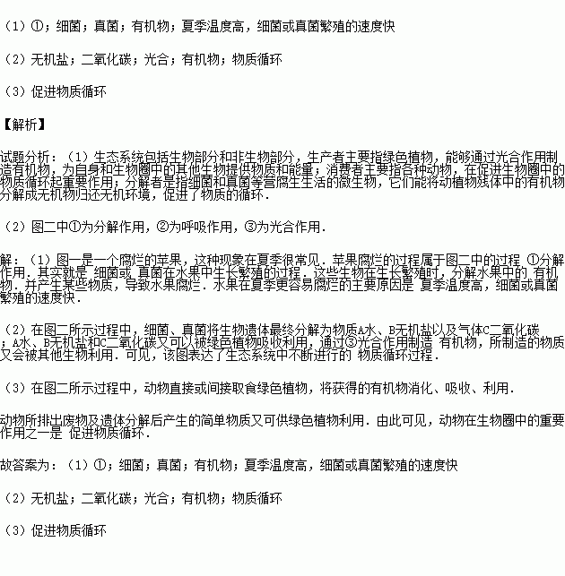 (1)图一是一个腐烂的苹果,这种现象在夏季很常见.苹果腐烂的过程属于图二中的过程 (填图二中的序号).其实就是 或 在水果中生长繁殖的过程.这些生物在生长繁殖时,分解水果中的 .并产生某些物质,导致水果腐烂.水果在夏季更容易腐烂的主要原因是 .