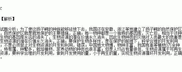 A、甲说:“扬子鳄是我国特有的珍稀动物,我们可以采取就地保护的方法”