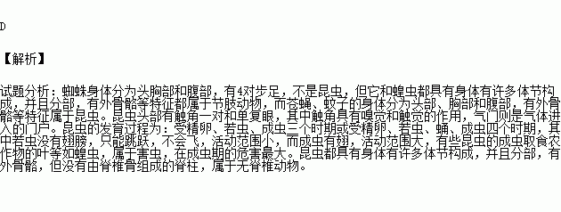 D.昆虫的身体由许多体节构成,但体内无脊柱