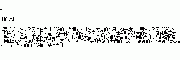 2015年吉尼斯世界纪录将土耳其男子苏丹•柯森列为活在世间的全球个子最高的人(身高达251cm),与之有关的内分泌腺主要是( )