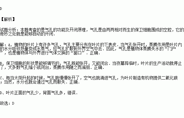 C.当太阳升起时,叶片的气孔慢慢张开,空气就涌进气孔