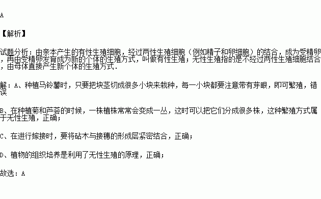 A.将马铃薯的块茎切成小块来种植时,不一定每块都要有芽眼