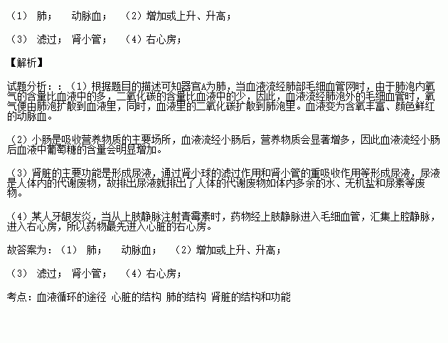 £¨1£©Í¼ÖÐÆ÷¹ÙAÊÇÈËÌåºôÎüϵͳ×îÖØÒªµÄÆ÷¹Ù£¬Õâ¸öÆ÷¹ÙÊÇ ¡£ÑªÒºÁ÷¾A´¦Ê±½øÐÐÆøÌå½»»»£¬ÑªÒº±äΪº¬Ñõ·á¸»¡¢ÑÕÉ«ÏʺìµÄ ¡£